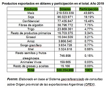 El maíz es el producto líder de las exportaciones chaqueñas al mundo, explicando casi un 44% del total de ventas de la Provincia. Luego, en segundo lugar -pero con un porcentaje significativamente menor- se encuentra la soja (20%). El complejo cerealero ocupa el segundo lugar en el total de las exportaciones argentinas (15,5% del total), con el maíz a la cabeza (6.000 millones de dólares), seguido por el trigo (2.800 millones de dólares).