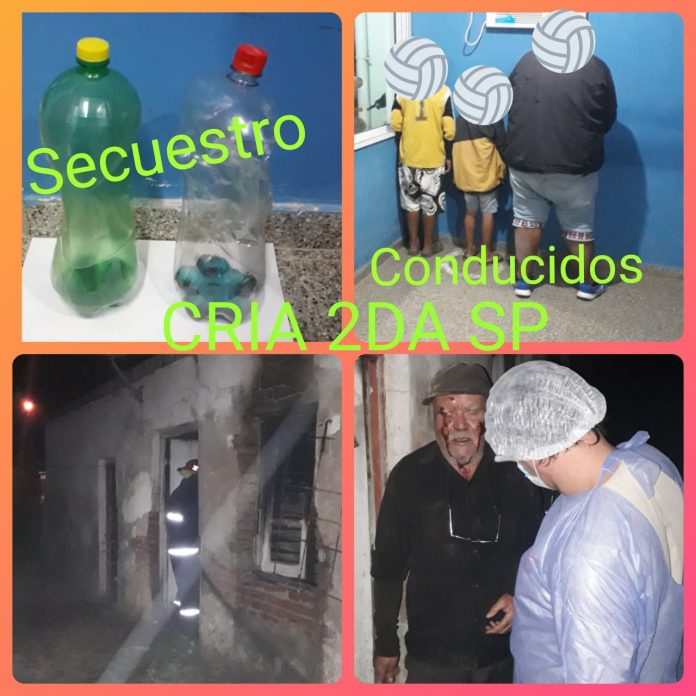 Se labró Acta de secuestro sobre dos botellas plásticas de 2.25 litros de capacidad, una color verde y otra transparente, cuales en su interior contienen una sustancia azulada, volátil, similar a nafta súper. El parte médico diagnosticó que el octogenario presenta “Traumatismo facial leve”. Se dio intervención a la Fiscalía en Turno y al Juzgado del Menor de Edad y la Familia.