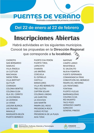 El Ministerio de Educación del Chaco recuerda a la comunidad que durante toda la semana actual continuará abierta la inscripción para el Programa Acompañar: Puentes de Verano, una iniciativa que busca promover la educación social y cultural mediante actividades recreativas, deportivas, artísticas y culturales. La iniciativa, destinada a estudiantes de escuelas primarias y secundarias de todas las regionales educativas de la provincia, e realizará desde el 22 de enero hasta el 22 de febrero.