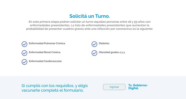 Se trata de un cuestionario dentro de la página web creada para la Campaña de Vacunación Provincial. El formulario al que se ingresa a través de https://elijovacunarme.chaco.gob.ar/ está dirigido a personas que tienen entre 18 y 59 años, con enfermedades preexistentes. Una vez analizada la información, en el mismo link podrán consultar día, lugar y horario de la vacunación individualmente.