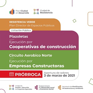 La Ciudad de Resistencia informó que se prorrogó hasta el 3 de marzo la apertura de sobres de ofertas de la licitación pública para la ejecución de cuatro plazoletas y del circuito aeróbico norte, los cuales se llevarán adelante con financiamiento del programa nacional Argentina Hace.