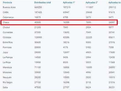 Con 24.087 dosis aplicadas hasta este viernes, el Chaco es la provincia con mayor cantidad de población inmunizada contra el coronavirus. Así se desprende del Monitor Público de Vacunación habilitado este jueves por el Ministerio de Salud de la Nación.