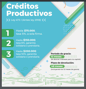 Cuenta con la Ley 437-I, de Créditos Productivos, que dispone de tres líneas directas estratégicas: préstamos de hasta $75.000, $150.000 y $200.000, todos con tasas y plazos sumamente competitivos y con condiciones superadoras a las de entidades bancarias