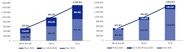 En comparación con las previsiones presupuestarias para el I Semestre 2021, mientras que el Norte Grande mostró ingresos automáticos un 15% por sobre lo presupuestado (+$68.913 millones), el resto de jurisdicciones presentó un 13% (+114.650 millones) para totalizar un incremento conjunto del 14% (+183.564 millones).