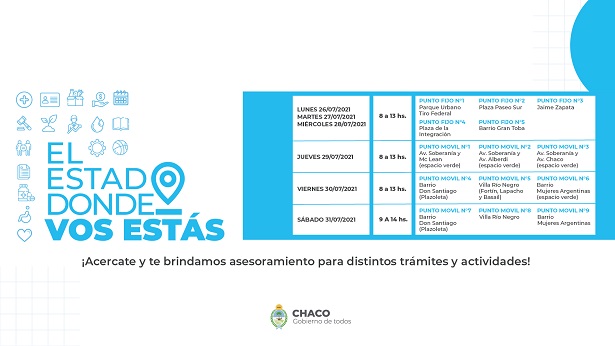 También habrá operativos de gestiones de PAMI y del Nuevo Banco del Chaco, que incluyen el Banco Móvil y un stand de consultas y tramitación de tarjetas de débito y crédito. A su vez, la Fundación Chaco Solidario asesorará sobre actividades solidarias del Estado y tanto el Instituto de Cultura como el de Deportes desarrollarán actividades artísticas, deportivas y lúdicas.