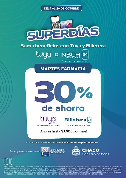 En farmacias, la promoción estará disponible los martes 12 y 19 de octubre. Mediante la tarjeta Tuya, se podrá acceder al 30% de reintegro con un tope de $2.000 mensuales. La medida aplica en un pago con tarjeta Tuya tradicional, Tuya joven, Tuya Pyme y Tuya Recargable. El beneficio se reintegra en el mismo resumen de cuenta que ingresa el consumo. Con la billetera NBCH24, se podrá acceder los mismos días a un reintegro del 30% con un tope de $1.000 mensuales. Combinando ambos beneficios es posible alcanzar los $3.000 de reintegro.