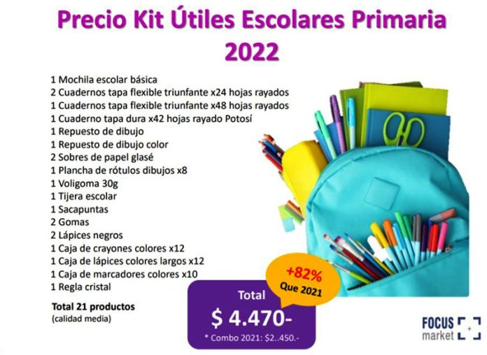 Un informe de Focus Market estimó que la suba de artículos escolares durante el año fue del 82%. Detallaron que en el 2021, una mochila básica costaba $832 y llegó al 2022 con un valor de $2.003; un cuaderno forrado de 48 hojas pasó de $137 a $234 y, un aumento similar se puede ver, por ejemplo, en una caja de 12 crayones, para la que su valor saltó de $105 a $185.