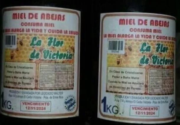 "Se trata de la Miel de abejas, marca: La Flor de Victoria, Producida y envasada por Leocadio Walter, Ruta 174 y Arroyo El Ceibo Victoria - Pcia. de Entre Ríos."