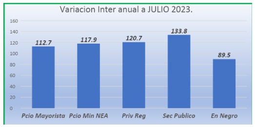 Durante el mes de julio de 2023 el nivel de precios minorista del NEA ascendió al 6,1% en tanto que el ajuste salarial a nivel nacional del sector privado fue del 10,8%, el sector público aumentó el 13,3% promedio, en tanto que el de menor incremento fue el sector de empleados en negro que tuvo una variación del 7%