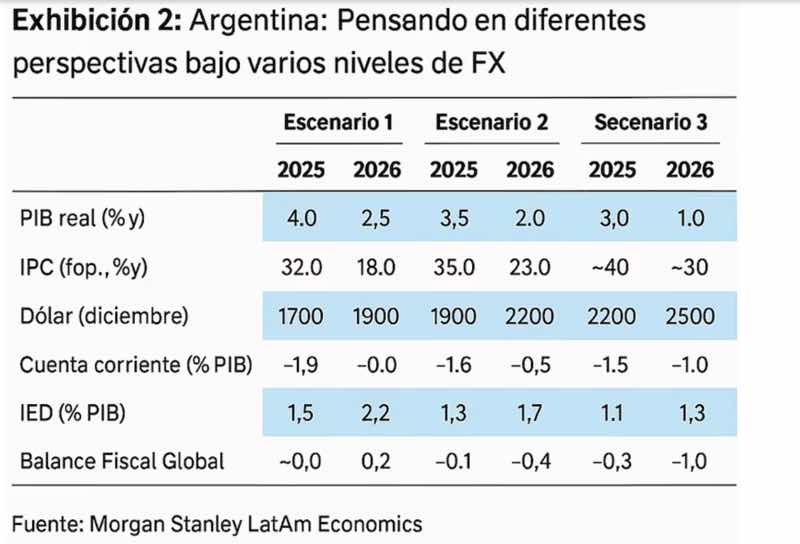 “Es probable un ajuste desordenado, con una depreciación del peso superior a la necesaria para compensar el escaso capital político del gobierno. En este escenario, el tipo de cambio por encima de 2.000 pesos resulta plausible. El gobierno lograría mantenerse, pero la agenda de reformas quedaría paralizada”, sostiene Morgan Stanley.