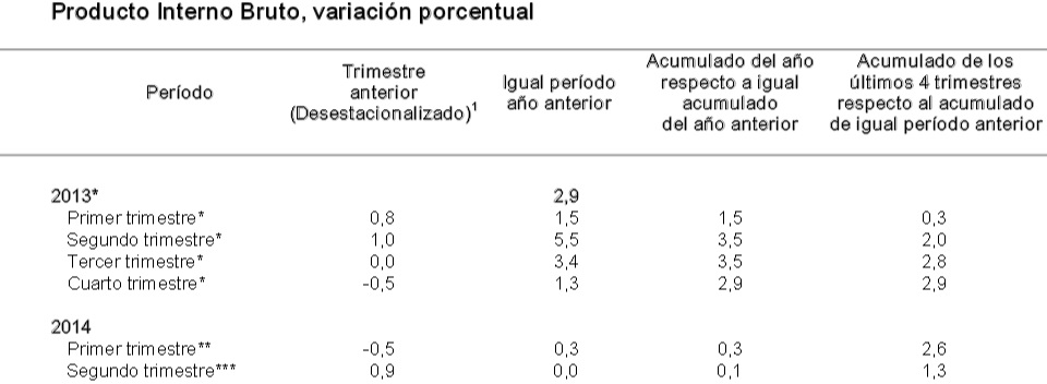 En síntesis podemos expresar que en el primer trimestre del 2014, el PIB fue de -0,5% con respecto al trimestre anterior, y en este periodo de medición,( 2do trimestre), la variación fue positiva del 0,9%