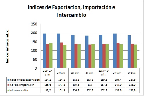 Por su parte respecto al tercer trimestre del año en curso, vale resaltar que este indicador mostró una baja del 1,5% respecto al tercer trimestre de 2013, motivado ello por la baja de los precios de las exportaciones y de las importaciones.