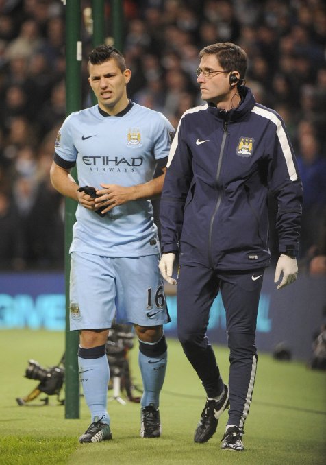 El Kun, goleador y figura del City, intentó recuperar una pelota a los dos minutos de juego, en una de sus primeras intervenciones en el partido, y quedó tendido en el suelo, casi sin moverse y tomándose con las dos manos la rodilla izquierda.