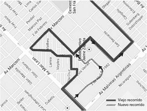 El nuevo recorrido prevé comenzar en el barrio 300 viviendas por Isaías hasta Ushuaia (siete cuadras al Oeste de la avenida Malvinas), seguir por Misionero Klein (calle 5) y luego por La Paz hasta avenida Belgrano, donde retomará la ruta habitual.