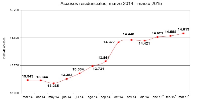 El acceso a internet durante marzo de 2015 creció un 9,5% respecto al año anterior y superó la cifra de 14, 6 millones de ingresos residenciales