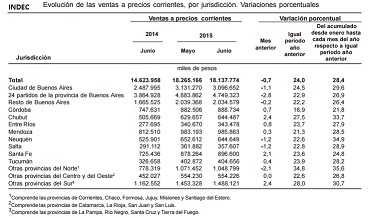 En el mes de junio de 2015 La variación interanual de las ventas totales a precios corrientes registró un aumento de 24%, y la región que sobresale como la de mayor variación es la conformada por estas provincias que enunciamos.