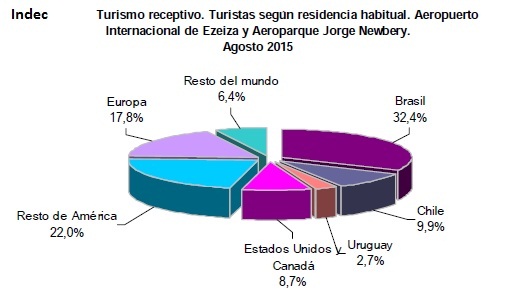 La distribución del origen de turistas que ingresaron por Ezeiza y Aeroparque son Brasil el 32,4%, Resto de América el 22%, Europa el 17,8%, Chile el 9,9%, Canadá y Estados Unidos el 8,7%, Resto del Mundo 6,4% y Uruguay el 2,7%