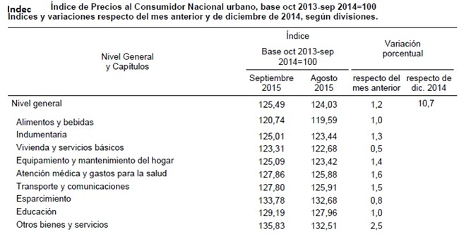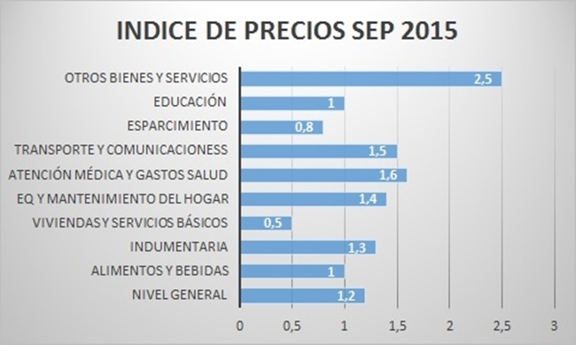 El Nivel General de Precios al Consumidor Nacional Urbano del mes de septiembre de 2015 ascendió al 1,2%
