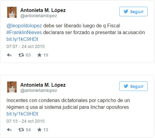 "@leopoldolopez debe ser liberado luego de que el fiscal #FranklinNieves declarara ser forzado a presentar la acusación", comenzó. Y siguió: "Inocentes con condenas dictatoriales por capricho de un régimen que usa al sistema judicial para linchar opositores".