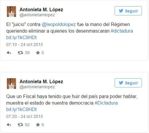 Luego agregó: "El 'juicio' contra @leopoldolopez fue la mano del Régimen queriendo eliminar a quienes los desenmascaran. Que un fiscal haya tenido que huir del país para poder hablar, muestra el estado de nuestra democracia".