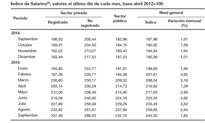 La variación salarial entre los meses de agosto y septiembre de 2015 arribaron al 2,5%, al 1,56% y 1,9% respectivamente, mientras que el índice general alcanzó al 1,82%