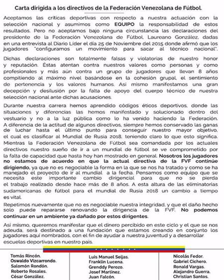Por ejempo, Gabriel Cichero, Salomón Rondón, el Maestrico González (ex River), Roberto Rosales, Tomás Rincón, Franklin Lucena y Nicolás Fedor son algunos de los futbolistas que se sumaron al reclamo público. Hace una semana, Fernando Amorebieta había renunciado a la selección en pedido de la renuncia del técnico Noel Sanvicente.