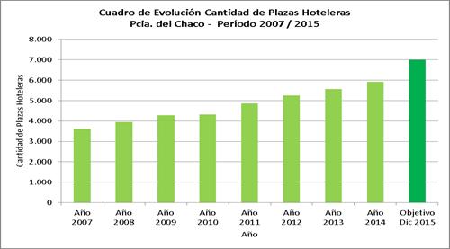 · Se duplicó la cantidad de plazas hoteleras pasando de 3.612 plazas en la provincia en el año 2007 a 7.000 plazas con la inversión pública y privada en las ciudades de Resistencia, Pcia. Roque S.Peña , Villa Ángela y J.J. Castelli, entre otras ciudades representativas.