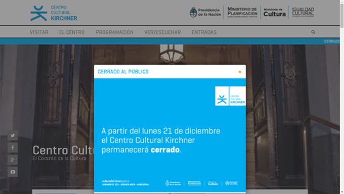 "El Centro Cultural Kirchner permanecerá cerrado desde el 21 de diciembre", informaba la página oficial del Centro Cultural Kirchner en un escueto comunicado.