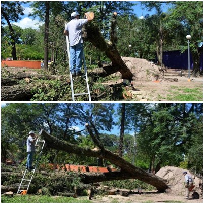 El viejo ejemplar de entre 60 y 70 años de edad cayó en la plaza 12 de Octubre en la mañana del pasado 31 de diciembre de 2015 durante la tormenta ocurrida en esta ciudad. Ante esta situación, los operarios de la Dirección de Paseos y Jardines de la comuna, dirigidos por el titular de la Unidad de Ordenamiento de Espacio Verdes, ingeniero agrónomo José Ruchesi y con la presencia de la secretaria general Patricia Petray, encararon una ardua tarea desde muy temprano en la mañana de este sábado 2 y que se extendió pasado el mediodía.