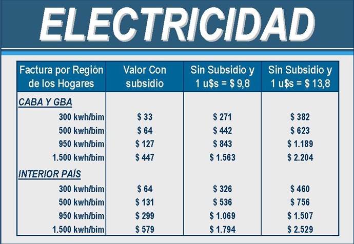 “El 97% restante se aplica a la demanda de hogares medios, bajos, además de toda la industria y comercios. Eso es para los que esgrimen el argumento de los supuestos ricos subsidiados para justificar un brutal aumento de tarifas", afirmó y brindó un cuadro comparativo para explicar "el impacto de quita de subsidios eléctrico a hogares incluyendo devaluación reciente".