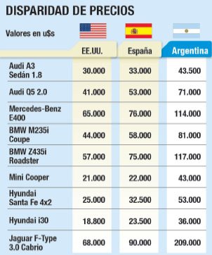 Si se toman los nuevos valores del mercado y se los compara con otros países, un consumidor local puede llegar a pagar hasta el doble de lo que cuesta en Estados Unidos, el segundo mercado en importancia, un vehículo similar. Es cierto que en muchos casos las configuraciones de cada mercado son diferentes por lo que la comparación no llega a ser exacta. La diferencia es menor en relación, por ejemplo, con Europa, pero sigue siendo elevada.
