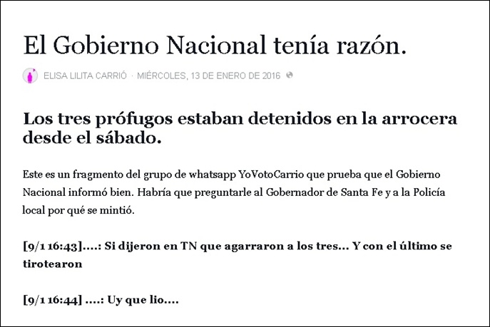 La diputada había publicado ayer en su cuenta de Facebook: "Los tres prófugos estaban detenidos en la arrocera desde el sábado. Este es un fragmento del grupo de whatsapp YoVotoCarrio que prueba que el Gobierno Nacional informó bien. Habría que preguntarle al Gobernador de Santa Fe y a la Policía local por qué se mintió".