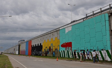 El artista plástico Milo Lockett comenzó a dar las primeras pinceladas del gran mural de 3.200 metros cuadrados ubicado en el viaducto de acceso a la ciudad de Resistencia, sobre ruta Nicolás Avellaneda y avenida Sarmiento.