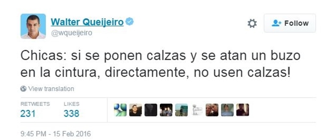 El concejal de Quilmes por el Frente Renovador y ex periodista deportivo, Walter Queijeiro, fue el blanco de duras críticas en la red social Twitter por un posteo que publicó anoche acusado de machista y misógino. "Chicas: si se ponen calzas y se atan un buzo en la cintura, directamente, no usen calzas!", fue el tweet de quien se hiciera conocido por la proclamada "patada descendente" cuando trabajaba en televisión.