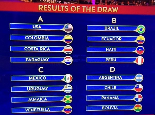 Finalmente se realizó el sorteo de la esperada Copa América Centenario que contará con 16 equipos divididos en cuatro grupos y se jugará en Estados Unidos. La fase de grupos se jugará del 3 al 14 junio.