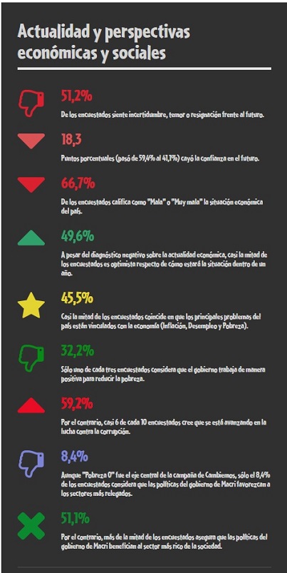 El trabajo realizado por la consultora Ibarómetro reveló además que más de la mitad de los consultados considera que Macri gobierna para los más ricos. Ponderan sin embargo la lucha contra la corrupción y aunque evalúan como negativa su situación económica actual son optimistas respecto del futuro.