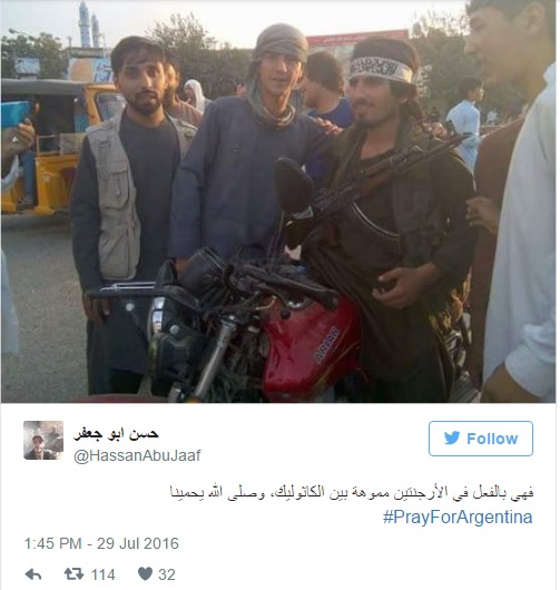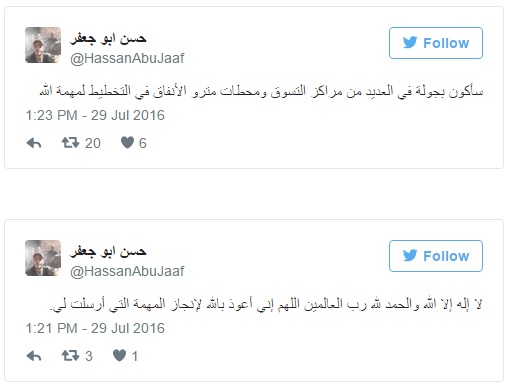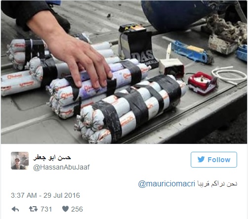La cuenta @HassanAbuJaaf tenía pocos seguidores pero cosechó muchos retuits en las últimas horas. No era para menos. En un momento convulsionado por la seguidilla de atentados terroristas en el mundo, la cuenta, que comenzó a circular el viernes por la noche y continuó durante las primeras dos horas de hoy, mencionaba en árabe al presidente Mauricio Macri y mostraba lugares muy concurridos de la ciudad de Buenos Aires: la Plaza de Mayo, el Shopping Abasto, el subte.