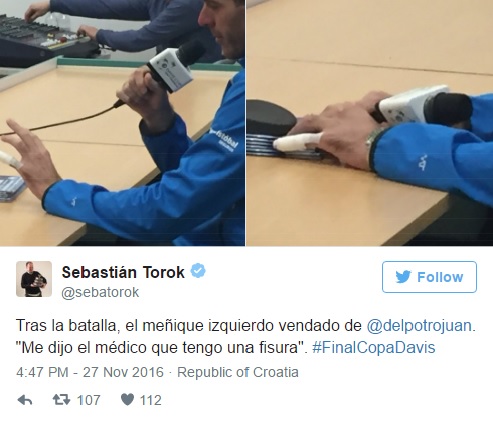 Zagreb. El tandilense Juan Martín Del Potro terminó el partido frente a Marin Cilic con el dedo meñique de la mano izquierda fisurado. "Tengo una fisura. Es este dedo", dijo Del Potro en la conferencia de prensa posterior al histórico triunfo frente a Cilic, señalando el meñique de la mano izquierda.