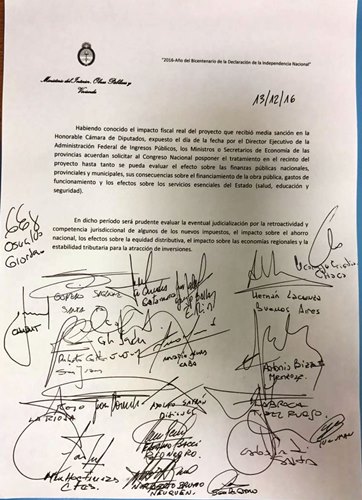 “Habiendo conocido el impacto fiscal real del proyecto que recibió media sanción en la Honorable Cámara de Diputados, expuesto el día de la fecha por el director Ejecutivo de la Administración Federal de Ingresos Públicos, los ministros o secretarios de Economía de las provincias acuerdan solicitar al Congreso Nacional posponer el tratamiento en el recinto del proyecto hasta tanto se pueda evaluar el efecto sobre las finanzas públicas nacionales, provinciales y municipales, sus consecuencias sobre el financiamiento de la obra pública, gastos de funcionamiento y los efectos sobre los servicios esenciales del Estado (salud, educación y seguridad)”, señala el documento que firmaron todos los representantes de las provincias.