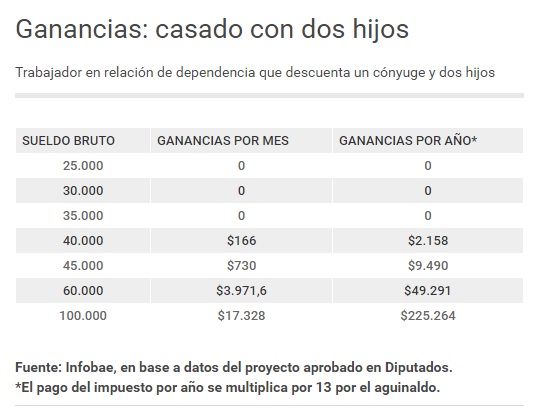 • Casados con dos hijos: el mínimo no imponible se estableció en los 37.000 (unos $30.710 netos). El límite es mayor ya que pudo hacer los descuentos por cónyuge e hijos.