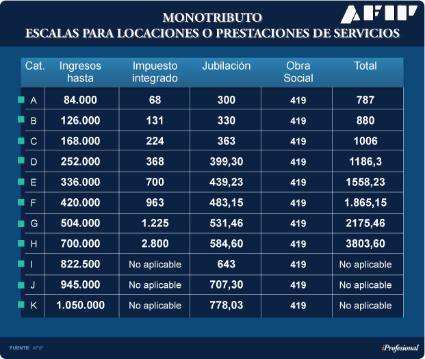 A continuación se detallan las nuevas escalas para el Monotributo para la prestación de servicios: