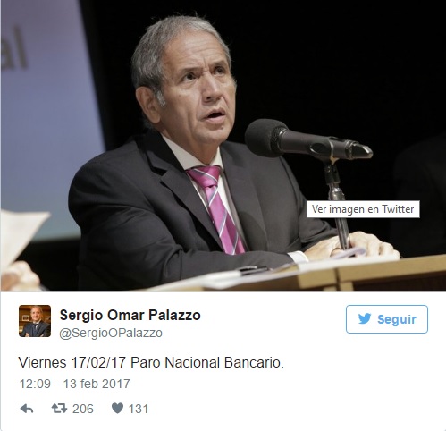 Así lo anunció el titular del sindicato, Sergio Palazzo, quien esta mañana había advertido sobre la convocatoria a una medida de fuerza en reclamo por la negociación salarial del sector. "Viernes 17/02/17 Paro Nacional Bancario", fue el mensaje que el gremialista compartió a través de su cuenta en Twitter.