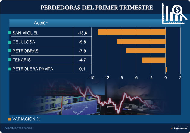 También registraron fuertes bajas en marzo la Petrolera del Conosur (-11%), San Miguel (-7%) y Petrobras (-5%), entre otras.