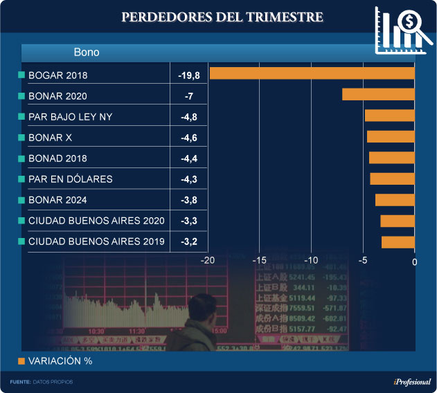 a otra cara de la moneda está dada por el resto de los bonos, ya que muestran caídas que en muchos casos superan el 3% y llegan hasta un rojo del 7%, como ocurre con el Bonar 2020.