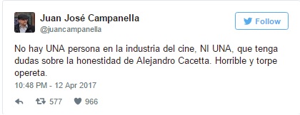 Enojo en la industriaLa salida del productor cinematográfico produjo un profundo malestar entre los hacedores del cine argentino. Uno de los primeros en manifestar su enojo fue el director Juan José Campanella, uno de los convocantes a la movilización oficialista del #1A. "No hay UNA persona en la industria del cine, NI UNA, que tenga dudas sobre la honestidad de Alejandro Cacetta. Horrible y torpe opereta", fustigó en su cuenta personal de Twitter.