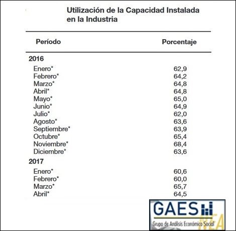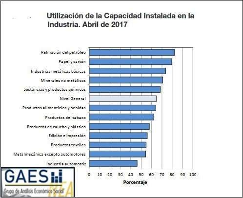 Según el organismo estadístico nacional, la utilización de la capacidad instalada en la industria se ubica en el 64,5% durante el mes de abril de 2017, mostrando de esta manera que aún no se pudo lograr el tan ansiado despegue de la actividad.