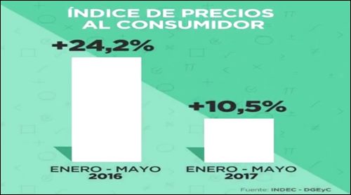En el gráfico nos muestra que el índice del precio al consumidor de enero a mayo de 2016 estaba en 24,2% y este año está en el 10,5%, que son buenos valores, porque si se compara un año con otro, obviamente este año estamos menos, pero esto nos indica que si en estos cinco meses está en 10,5% difícilmente estemos en un 17%, estimándose que vamos a superar el 20%, situación ésta que hace que también las paritarias se deben realizar por montos superiores, por porcentajes superiores, porque hay que recuperar lo del año pasado más lo de esta inflación.