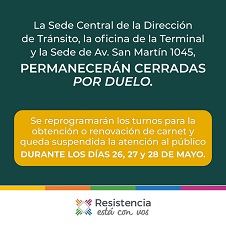 Locales | Resistencia informa que la sede central de la Dirección de Tránsito, la oficina ubicada en la Terminal de Ómnibus, y la situada por avenida San Martín 1045, permanecerán cerradas por duelo, durante este miércoles 26, jueves 27 y viernes 28 de mayo.