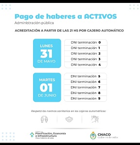 Locales | Jubilados y pensionados cobrarán el 28 de mayo, mientras que el sector activo lo hará el lunes 31 (DNI finalizados en 0, 1, 2, 3 y 4) y martes 1 de junio (en 5, 6, 7,8 y 9) a fin de evitar aglomeraciones en cajeros automáticos atento a las medidas sanitarias vigentes ante la pandemia por Covid-19. Además se evalúan medidas económicas dirigidas a los sectores más afectados por la pandemia y la reducción de la circulación.