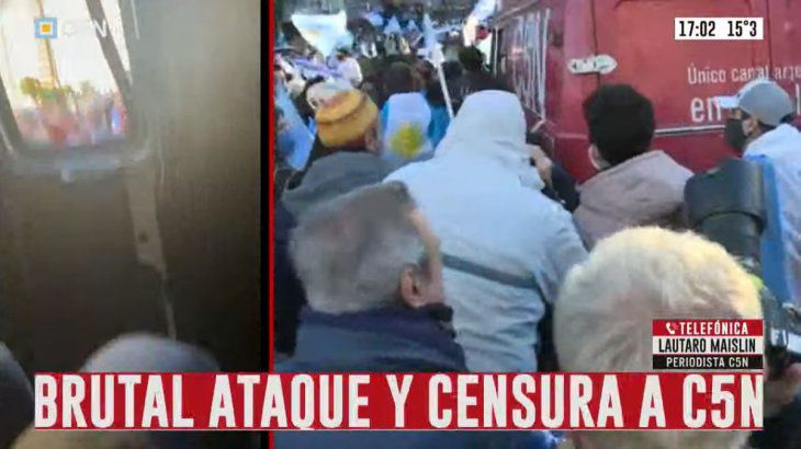Un grupo de individuos se acercó a la camioneta del canal de noticias y a los golpes rompieron una ventana. Asimismo, agredieron a los trabajadores de prensa que se encontraban allí. Los periodistas debieron abandonar el lugar ante la inacción de los agentes de la Policía de la Ciudad.